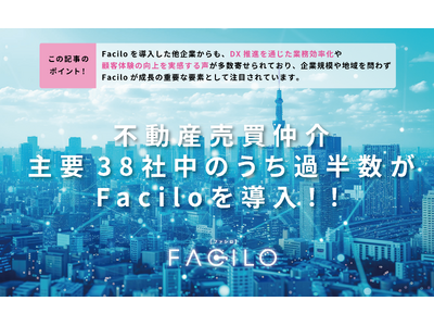 株式会社Facilo(本社:東京都港区、代表取締役 CEO:市川 紘、以下当社)は、住宅新報が発表した「主要不動産流通各社 2024年度通期の売買仲介実績」において、掲載された主要38社中過半数にあたる20社が不動産コミュニケーションクラウド『Facilo』(以下、Facilo)を導入していることをお知らせします。導入済み20社のうち13社は、全店舗またはそれに準じる規模の本導入をしています。
