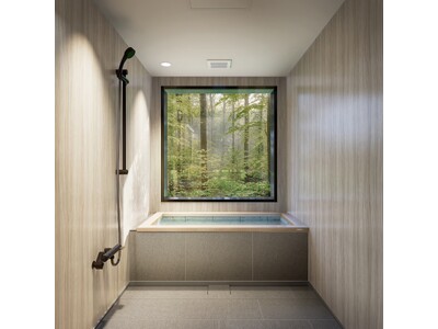 檜と十和田石を組み合わせた浴槽を標準仕様とし、価格を抑えながらも贅沢な素材感を実現。