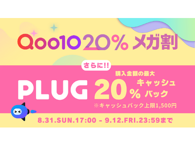 本キャンペーンでは、2025年8月31日(日)17:00から2025年9月12日(金)23:59までの期間中に『PLUG』を利用してQoo10でお買い物をされたお客様に、購入金額の最大20%のキャッシュバックを付与いたします。