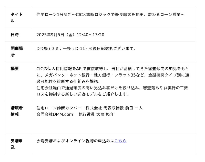 住宅ローン診断カンパニー株式会社(本社:東京都港区、代表取締役:前田一人、以下「当社」および「住宅ローン診断カンパニー」)は、2025年9月4日(木)、5日(金)の2日にわたってグランフロント大阪にて開催される、国内最大の金融機関向けITフェア「FIT 大阪2025 金融国際情報技術展」に出展およびセミナーに登壇いたします。