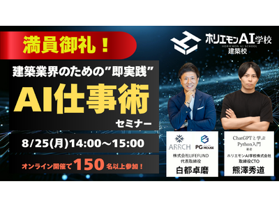「建築業界のための”即実践”AI仕事術セミナー」(主催:ホリエモンAI学校建築校)は150名以上参加。 参加者アンケート満足度90%以上を記録、「業務効率化や人手不足解消のヒントが得られた」と高評価。