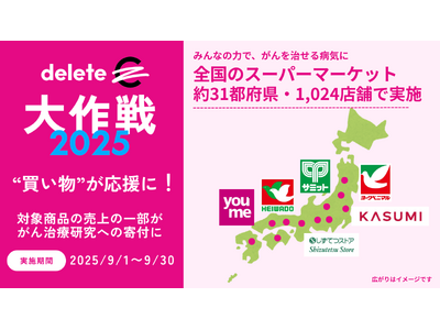 今年は、全国のスーパーマーケット6社(サミット株式会社・株式会社平和堂・株式会社ヨークベニマル・株式会社カスミ・株式会社イズミ・株式会社静鉄ストア)とタッグを組み、買い物ががん治療研究の応援につながるカジュアルソーシャルアクション(※以下CSA)「deleteC大作戦 2025 inスーパーマーケット」を全国約31都府県・1,024店舗で開催いたします。対象商品を購入することで1点につき1円(静鉄ストアは2円)ががん治療研究に寄付され、日常の買い物を通じて誰もが気軽に研究支援に参加できる取り組みです。