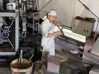 刀剣作家 宮下 正吉氏とつくばヘレナ高等学院による教育支援パートナー協定締結時(2025年7月 筑波鍛刀場前にて)「左から 刀剣作家 宮下 正吉氏、つくばヘレナ高等学院 理事長 松本マーク」