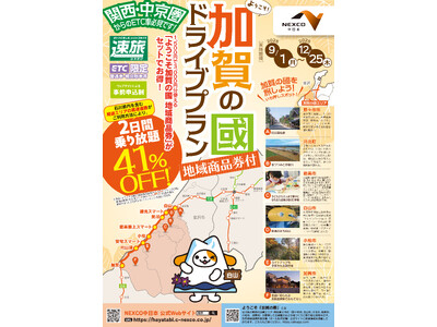南加賀6市町(野々市市、白山市、川北町、能美市、小松市、加賀市)でつくる加賀地域連携推進会議(オール加賀会議)はNEXCO中日本と連携し、関西・中京をターゲットに、最も利用の多い自家用車での来訪者を増加させるため、高速道路の周遊パスと地域商品券をセットにしたETC車限定のドライブ旅行商品「速旅『ようこそ加賀の國ドライブプラン』」の販売を開始しました。