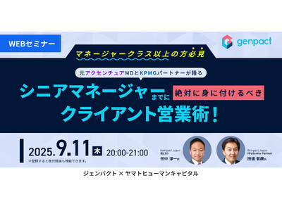 ヤマトヒューマンキャピタル株式会社(本社:東京都千代田区、代表取締役:堀江 大介)は、2025年9月11日(木) 20:00よりオンラインにて、ジェンパクト株式会社 元CEO 田中淳一氏、同社 VP&Senior Partner 田邊智康氏にご登壇いただくウェビナー『シニアマネージャーまでに絶対に身に着けるべきクライアント営業術!』を開催いたします。