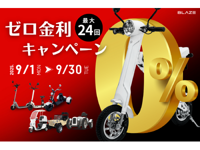 株式会社ブレイズ(愛知県名古屋市、代表取締役:市川秀幸、以下ブレイズ)は、2025年9月1日(月)~9月30日(火)の期間、ブレイズの電動モビリティをローンでご購入頂いたお客様に対して、利息分をブレイズが負担する「ゼロ金利キャンペーン」を実施いたします。