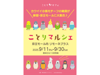 「小鳥たちを眺めながら、まったりコーヒータイム♪」をコンセプトにした「ことりカフェ上野本店」(http://kotoricafe.jp/)を運営する株式会社ことりカフェ(本社:東京都台東区 代表取締役 川部志穂)は、2025年9月より、都内各地の京王百貨店サテライト店3店舗(新宿・八王子・吉祥寺)で、カワイイ小鳥雑貨や文具などを集めた「ことりマルシェ」を開催いたします。それぞれ期間限定となりますので、この機会をお見逃しなく!!