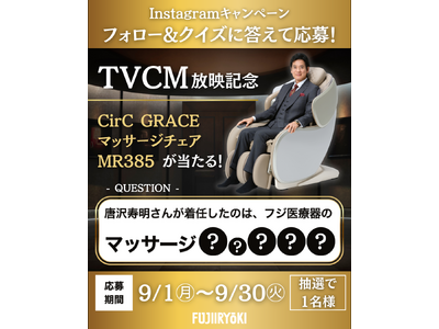 (本社:大阪市中央区)は、当社マッサージチェアマンに着任された唐沢寿明さんご出演のテレビCM全国放映を記念しまして、Instagram上でのクイズに正解した方の中から抽選で1名様に「
