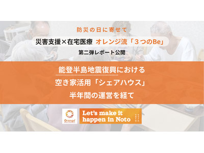 医療法人社団オレンジ(所在地:福井県福井市/代表理事:紅谷浩之)は、防災の日(9月1日)に合わせ、 「災害支援におけるオレンジ流在宅医療の『3つのBe』第二弾レポート」を公開しました。 本レポートでは、2024年1月に発生した能登半島地震の復興支援として実施した「空き家活用シェアハウス」半年間の運営記録をまとめています。