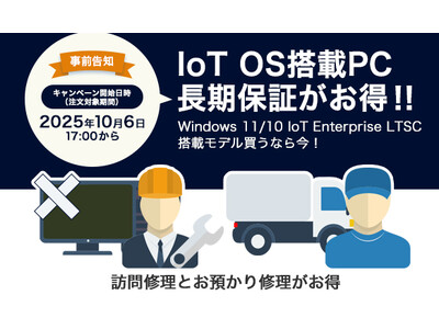 10月6日17:00に開始するIoT OS搭載PCの「長期保証がお得なキャンペーン」では、5年以上の「お預かり修理」と「訪問修理」の定額保守サービスが、