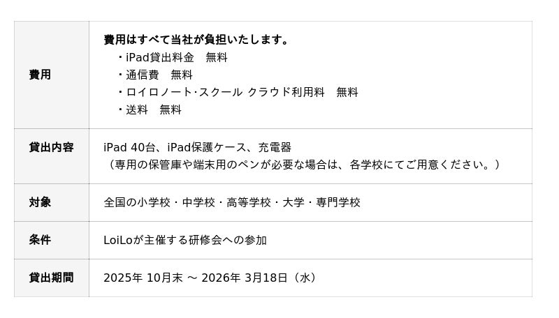 私たちLoiLoは、今年も40台のiPadとロイロノート・スクールを無料で貸出します。貸出料金、通信費、クラウド利用料、送料 すべて無料です。端末にはロイロノートがインストールされており、届いたその日からご利用いただけます。1人1台環境での学びづくりを全力で応援いたします。