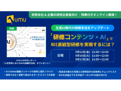 パフォーマンス向上を支援するAI活用学習プラットフォーム「UMU(ユーム)」を展開するユームテクノロジージャパン株式会社(本社:東京都新宿区、代表取締役:松田 しゅう平、以下 ユームテクノロジージャパン)は、企業研修を提供する研修会社や企業の研修ご担当者の皆さまを対象に、「生成AI時代の研修手法をアップデート。『研修コンテンツ × AI』でROI直結型研修を実現するには?」をテーマにした説明会を複数日程で開催します。