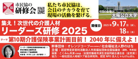 介護系事業者900団体の会員を有し、身近な地域での助け合い・支え合い、優しい福祉のある地域社会づくりを推進している認定特定非営利活動法人市民福祉団体全国協議会(本社:東京都新宿区、代表理事:鷲尾公子・とよしま亮介、略称市民協)は、会員のチカラを育て、現場の活動を繋げるため、2025年9月17日から18日にかけて開催するリーダーズ研修2025in大阪「第10期介護保険事業計画目前!2040年に備えよ!」内でのリーダーズ研修記念講演in大阪の登壇者が決定しました!「地域包括ケアの深化(第10期介護保険事業計画に向けて)」と題して、厚生労働省 近畿厚生局 地域包括ケア推進課課長 杉田 塩(すぎた しお)氏が登壇します。申し込みの最終締め切りは9/10まで!締切間近です。お急ぎください。