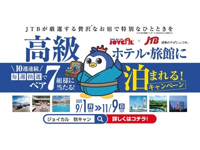 株式会社ジョイカルジャパン(本社:東京都千代田区、代表取締役社長 CEO 早川 由紀夫)は、2025年9月1日より、カーリース契約や車検利用を検討するユーザーを対象に、ジョイカル秋のキャンペーン企画、『10週連続毎週ペア7組様に当たる!高級ホテル・旅館に泊まれる!キャンペーン』を開始しました。契約者の中から毎週抽選で7組に、10万円相当の高級ホテル・旅館のペア宿泊券をプレゼントします。