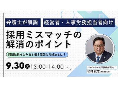 今回、弁護士法人TLEO虎ノ門法律経済事務所では、「『採用ミスマッチの解消のポイント』-問題社員を生み出す根本原因とは対処法とは?-」をテーマにオンラインセミナーを実施いたします。
