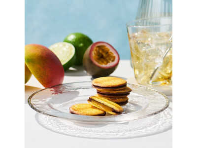 マンゴーピューレ、パウダーを練り込んで香り豊かに焼き上げたクッキーで、マンゴー、パッションフルーツ、ほのかにライムを利かせて炊き上げたとろけるキャラメルとミルクチョコレートをサンドしました。