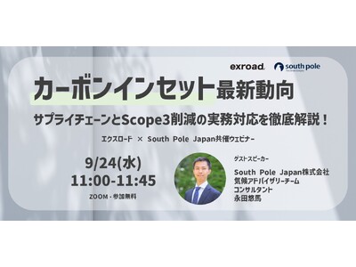 カーボンクレジット・排出量取引制度オールインワンデータベースを提供する株式会社exroad(エクスロード、本社:東京都港区、代表取締役:木村圭佑)は、「カーボンインセット最新動向 ― サプライチェーンとScope3削減の実務対応を徹底解説!」と題し、South Pole Japan株式会社と共同で、9月24日(水)11:00‐に無料ウェビナーを開催いたします。