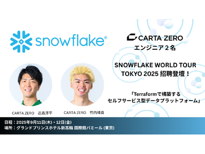 株式会社CARTA HOLDINGSのグループ会社で、デジタルマーケティングを中心とした事業を展開する株式会社CARTA ZERO(本社:東京都港区、代表取締役CEO:宇佐美 進典、以下「CARTA ZERO」)は、2025年9月11日(木)・12日(金)の2日間にわたりグランドプリンスホテル新高輪 国際館パミールにて開催されるデータクラウドカンファレンス「SNOWFLAKE WORLD TOUR TOKYO 2025」において、当社所属のエンジニア2名が登壇することをお知らせいたします。