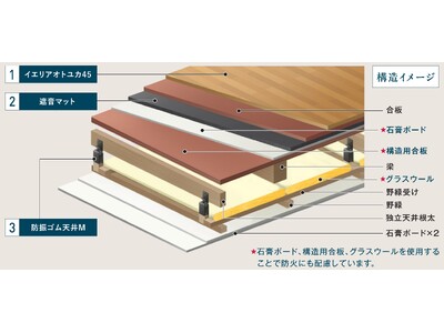 そこで今回、当社の防音建材を複合的に組み合わせた、当社ならではの遮音床構造として『MUTECT』の提案を開始いたしました。『MUTECT』は、床構造材に当社の直張防音床材『イエリアオトユカ45』、床下地材『遮音マットS09/S18』、防音用施工部材『防振ゴム天井M』※1を組み合わせたもので、(一財)建材試験センターにて遮音性能を測定した結果、一般的なマンションで要求されるレベルの床衝撃音遮断性能※2が得られました。また、当社製品だけでなく一般的な木造アパートに要求される「1時間準耐火基準」を満足するために必要な床構造材を組み合わせた状態でご提案するため、そのまま導入していただくことで複雑な防音設計をしなくても、簡単に気になる生活音を軽減することができます。