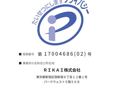 RIKAI株式会社(本社:東京都新宿区、代表取締役:DOAN HAI BANG)は、一般財団法人日本情報経済社会推進協会(JIPDEC)が認定する「プライバシーマーク(Pマーク)」の更新審査を無事に終了し、認定を更新いたしました。