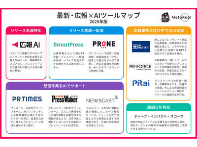 メディアに掲載されやすいプレスリリースの生成と採点ができるAIエージェント搭載『広報AI』を提供するメタリアル・グループの株式会社ロゼッタ(本社:東京都千代田区、代表取締役:五石 順一)は、AIを活用した広報業務支援ツールを体系的に分類・整理した国内初(※1)のカオスマップ「最新 広報×AIツール 2025年版」を公開しました。