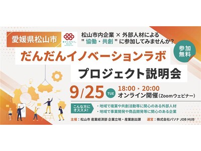 今年度より開始する「だんだんイノベーションラボ(外部人材等活用イノベーション促進事業)」では、松山市内企業と市外の人材や企業、特に高度な技術やスキルを有する人材やスタートアップ企業(以下「外部人材」)とのマッチングを通じて、新しいアイデアや高度な技術による新事業の創出につなげ、地域経済の活性化を目指してまいります。
