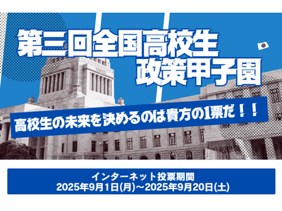 公益社団法人日本青年会議所(所在地:千代田区麹町2丁目12-1 VORT半蔵門7F、会頭:外口真大、以下「日本JC」)が主催する「第三回全国高校生政策甲子園」では、「最優秀賞」を決める国民投票(インターネット投票)の受付が開始しました。投票受付期間は、2025年9月1日(月)から20日(土)までの20日間です。