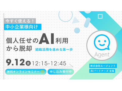 株式会社エージェント(本社:東京都渋谷区、代表取締役:四宮浩二 証券コード:7098)は、AI導入総合支援サービス「AIパートナーズ」において、企業向けに無料オンラインセミナー「個人任せのAI利用から脱却、組織活用を進める第一歩」を、2025年9月12日(金)に実施します。