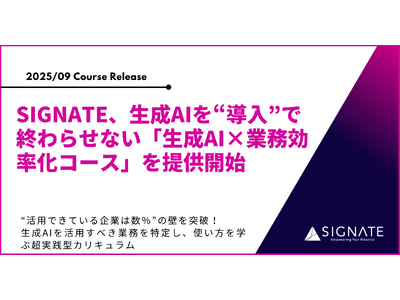 企業のDX内製化を支援する株式会社SIGNATE(本社:東京都港区、代表取締役社長:齊藤 秀、読み方:シグネイト、以下「SIGNATE」)は、多くの企業が直面する「生成AIを“導入”で終わらせてしまう」課題を解決するため、生成AIを適用すべき業務の「特定方法」と「活用方法」をセットで学ぶeラーニング「生成AI×業務効率化コース」を新たにリリースいたしました。