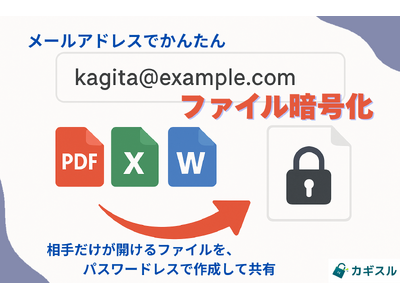 「カギスル」は、共有相手のメールアドレスを入力するだけで、その相手だけが閲覧できる暗号化ファイルを作成できるサービスです。パスワード付きZIPに代わる、安全で利便性の高いファイル共有手段を提供します。