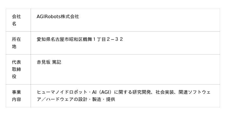 AGIRobots株式会社(以下、AGIRobots)は、2025年9月8日(月)~9日(火)にポートメッセなごやで開催される「ROSCon JP 2025」において、ブロンズスポンサーとして協賛するとともに、9月9日(火)のカンファレンス当日にブース出展いたします。AGIRobotsは、ヒューマノイドロボットおよび汎用人工知能(AGI)を用いて、人々の生活を豊かにすることを目標に研究開発・社会実装に取り組んでいます。なお、ROSCon JP 2025は前日にワークショップ、当日にカンファレンスを実施する二日構成のイベントです。