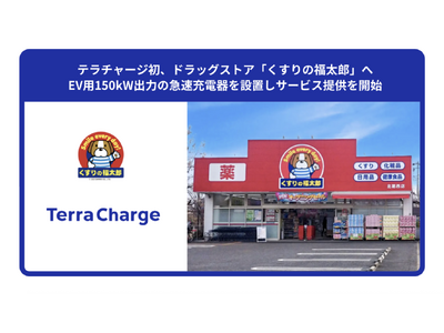電気自動車(EV)向け充電サービス「Terra Charge(テラチャージ)」を展開するTerra Charge株式会社(本社:東京都港区、代表取締役社長:徳重徹、以下、「当社」)は、ツルハグループの株式会社くすりの福太郎(本社:千葉県鎌ケ谷市、代表取締役社長:春田康行、以下、「くすりの福太郎」)が展開する「くすりの福太郎 北葛西店」へ150kW出力の急速充電器1口の設置を完了しEV充電サービスの提供を開始したことをお知らせいたします。
