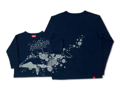 ほっこりとあたたかみがありながら、描きこまれたペン画ならではの繊細なタッチが魅力の「かめいち堂」が描くくじらと生き物たちのイラストを長袖Tシャツのフロントからバックにかけて大胆にプリントしました。