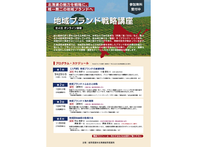 経済産業省北海道経済産業局は、北海道内の自治体や生産組合関係者などを対象に、地域団体商標などの知的財産を活用したブランド形成を支援するため、地域ブランドの構築・展開をテーマとした全4回のオンライン講座を開催します。