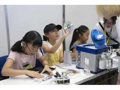 ブックオフグループホールディングスのブースより。CDやDVDを研磨機で加工する工程を体験する子どもたち。