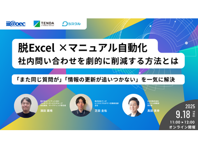 マニュアルトータルソリューションを軸に「ホワイトカラーの業務効率化」を推進する株式会社テンダ(本社/東京都渋谷区、代表取締役会長兼社長CEO/薗部 晃、以下「テンダ」)は、3社共催ウェビナー『脱Excel×マニュアル自動化~社内問い合わせを劇的に削減する方法とは~』を