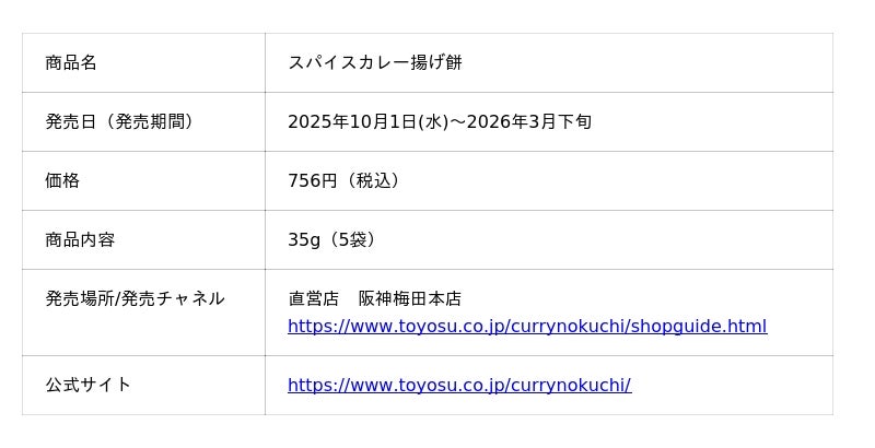 とよす株式会社(本社:大阪府池田市 社長:眞田 昌彦)は、阪神梅田本店に展開しているカレーせんべい専門店「カレーのくち」において、『スパイスカレー揚げ餅』を2025年10月1日(水)から期間限定で発売いたします。