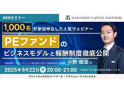ヤマトヒューマンキャピタル株式会社(本社:東京都千代田区、代表取締役:堀江 大介)は、2025年9月22日(月) 20:00よりオンラインにて、マラトンキャピタルパートナーズ株式会社 代表取締役/共同パートナー/一般社団法人日本プロ経営者協会代表理事の小野 俊法氏にご登壇いただくウェビナー『PEファンドのビジネスモデルと報酬制度徹底公開』を開催いたします。