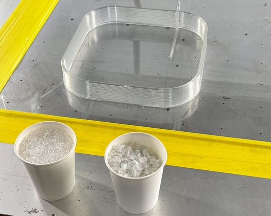 粉剤したプラスチック材を直接投入して3Dプリントしたサンプル。手前のカップは入っているのはペレット材と粉砕材。