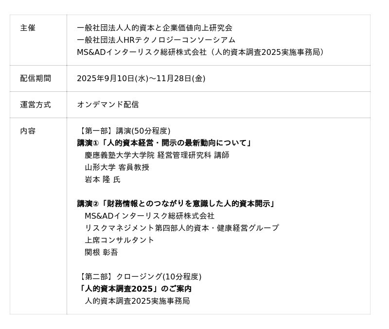 HR総研(ProFuture株式会社/所長:寺澤康介)は、一般社団法人人的資本と企業価値向上研究会(代表理事:松岡仁)、一般社団法人HRテクノロジーコンソーシアム(代表理事:香川憲昭)と共同で、人的資本経営と開示に関する企業・団体等の取組状況を大規模調査する「人的資本調査2025」を実施します。また、本調査の実施を記念し、外部から評価される人的資本経営・開示に必要な取組みを紹介するオンラインセミナーを開催します。