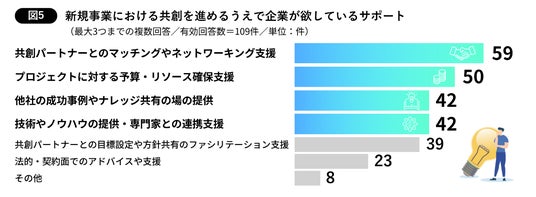 新規事業開発で望む共創の形態は「スタートアップとの共創」「他の大企業との共創」が上位を占め、企業が最も欲しいサポートは「共創パートナーとのマッチングやネットワーキング支援」であることが分かる。