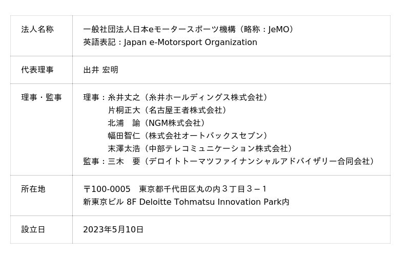 一般社団法人日本eモータースポーツ機構(JeMO)法人概要