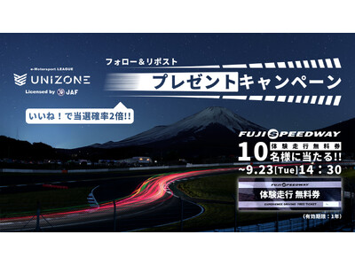 国内で唯一JAF(日本自動車連盟)の公認を受けたeモータースポーツ大会(レーシングゲームを使用したeスポーツ大会)「UNIZONE(ユニゾーン)」を運営する一般社団法人日本eモータースポーツ機構(東京都千代田区、代表理事:出井宏明、以下「JeMO」)は、UNIZONE 2025を応援してくださった皆さまへの感謝の気持ちとして、UNIZONEのXアカウントをフォローし、該当する投稿をリポストしてくださった方の中から10名様に、富士スピードウェイの体験走行無料券をプレゼントするキャンペーンを実施いたします。