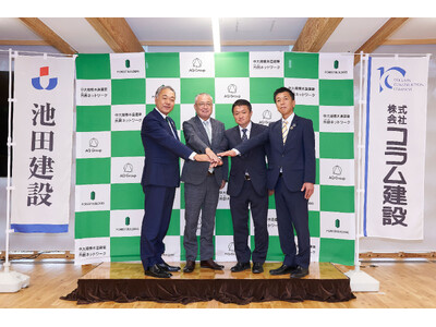 9月10日行われた記者発表会。左からAQ Group・宮沢俊哉会長、池田建設・池田章社長、コラム建設・樺島進一郎社長、AQ Group・加藤博昭社長