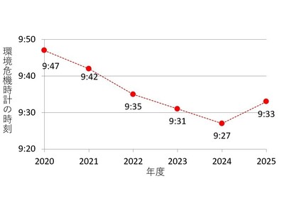 ● 2021年から2024年まで4年連続で針が戻っていたが、環境危機時計の時刻は昨年より6分進み、9時33分になった。