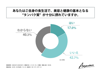 続いて、「自身の食生活で、美容と健康の基本となる"タンパク質"が十分に摂れているか」を尋ねる設問への回答では、1位が「いいえ」で42.7%、2位が「わからない」で40.3%、3位が「はい」で17.0%という結果になりました。この結果から、20代~50代女性のうち、食生活で"タンパク質”が十分に摂れていると回答した人の割合は2割未満であることが判明しました。