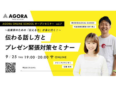 株式会社AGORAでは、2025年9月25日(木)に「伝わる話し方・緊張対策」をテーマにした創業WEBセミナーを開催します。