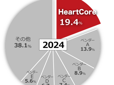 ハートコア株式会社 (本社:東京都品川区、代表取締役社長:神野 純孝、ハートコア)は、このたび、当社のオールインワンパッケージ型CMS「HeartCore CMS」が、富士キメラ総研発刊の『ソフトウェアビジネス新市場 2025年版』において、アプリケーション/CMSパッケージのカテゴリで、 2024年度のシェアNo.1※(金額ベース)を達成し、2016年度から9年連続※1シェアトップとなったことをお知らせいたします。