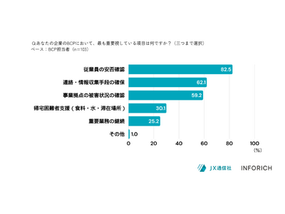 企業のBCP担当者に、所属企業のBCPにおいて最も重要視している項目を聞いたところ「従業員の安否確認」が82.5%。ついで「連絡・情報手段の確保」が62.1%、「事業拠点の被害状況の確認」が59.2%となりました。