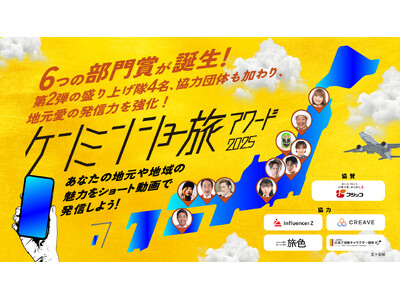 ケンミンショー旅アワード実行委員会(読売テレビ放送株式会社、株式会社プログレス)は、“ケンミン愛”あふれるショート動画を募集するコンテスト『ケンミンショー旅アワード2025』について、個性豊かな6つの部門賞を新設しました。また全国各地で地域の魅力を発信しアワードを盛り上げる「ケンミン盛り上げ隊」第2弾を発表。さらに、インフルエンサーZ株式会社、株式会社CREAVE、ご当地キャラクター協会、旅色(株式会社ブランジスタメディア)との連携により、投稿・選考・露出導線を強化します。ますます広がる“ケンミン愛”の輪にご期待ください!